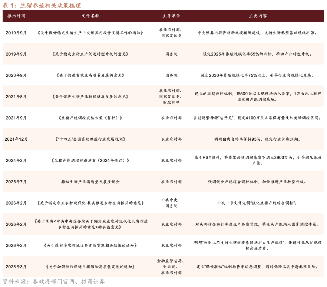 当前生猪养殖行业已处于典型周期底部区间,核心特征为行业持续亏损与能繁母猪存栏连续去化,供给端收缩基础逐步夯实,为新一轮周期启动提供支撑。在产能调控方面,政策体系已形成闭环:自2021年建立能繁母猪调控“总开关”,到2024年基于养殖效率提升将调控基准下调至3900万头,再到2026年对头部企业实施年度生产备案、约束无序扩张,政策导向已由“保供扩产”转向“精准控产、平滑周期”。整体来看,政策加速低效产能出清,稳定供给节奏、抑制价格大幅波动,为行业周期修复与反转提供制度性支撑。