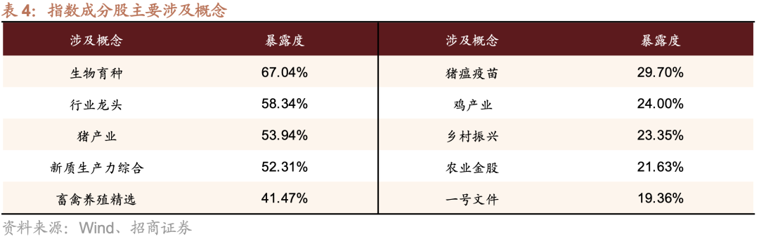 如表4所示,在概念暴露层面,畜牧养殖指数精准锚定生猪养殖核心赛道,对猪产业、生物育种、猪瘟疫苗、畜禽养殖精选、新质生产力及乡村振兴等现代农业产业链相关概念形成了深度覆盖,且各核心概念暴露度均处于较高水平,充分体现了其深度聚焦核心养殖资产、紧抓行业龙头的鲜明定位。