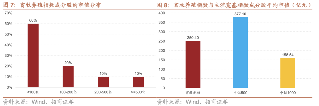如图7、图8所示,畜牧养殖指数成分股的市值主要集中在低于100亿元的小市值区间,占比达到60%,100-500亿区间的中市值成分股合计占30%,500亿以上大市值成分股占10%。该指数在成分股数量上以小市值股票占优,但其包含了部分大市值的大型养殖龙头,拉高了整体的平均市值重心。与其他指数对比发现,畜牧养殖产业指数平均市值250.40亿元,高于中证1000、低于中证500,属于中小市值区间。