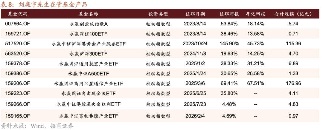 如表8所示,刘庭宇先生目前管理10只被动指数型基金产品(不包括ETF联接基金),覆盖了创业板、沪深300、深证100、黄金产业、通用航空、国证商用卫星通信、自由现金流、港股通央企红利及畜牧养殖等多个投资赛道,构建了多元化的产品矩阵。