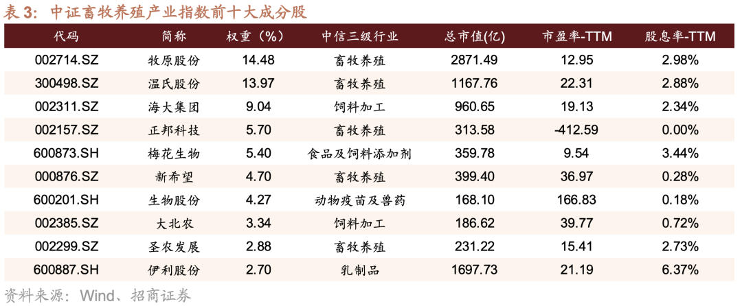 从成分股定位看,畜牧养殖指数精准聚焦生猪养殖及相关产业链核心领域,前十大成分股涵盖了“畜牧养殖 + 饲料加工 + 动物疫苗及兽药”细分领域的龙头企业。如表3所示,排名第一的牧原股份与排名第二的温氏股份锚定生猪养殖的核心板块。前两大龙头企业权重合计接近30%,使得该指数具备较高的猪周期纯度,深度聚焦核心养殖龙头企业。