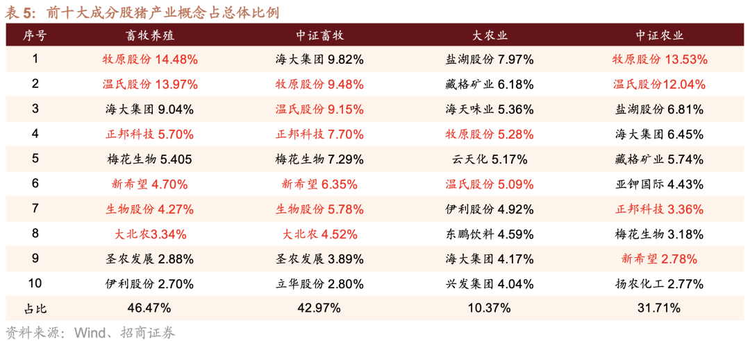 对比发现,畜牧养殖指数在头部生猪养殖企业的权重配置更为集中,其在相关领域的超配主要覆盖牧原股份(+5.0%)与温氏股份(+4.8%)这两家生猪养殖巨头,累计超配比例接近10%。此外,畜牧养殖指数中含猪概念的前十大成分股累计权重占总体比例达到46.47%,高于中证畜牧指数的42.97%。
