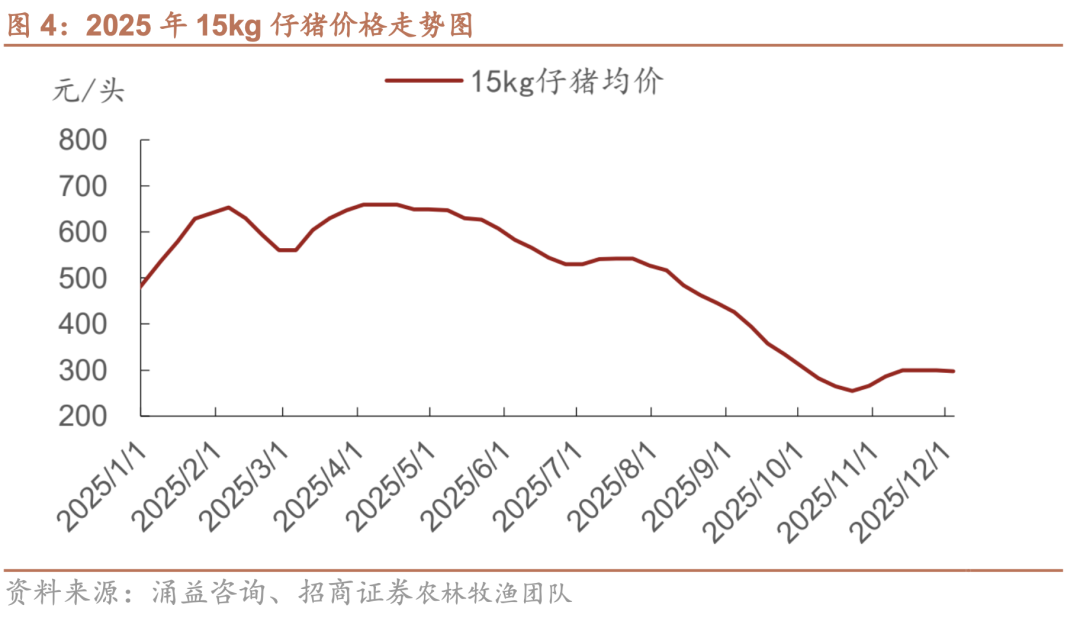 周期底部往往伴随养殖主体对后市盈利预期的转弱,这种预期直接反映在仔猪价格的持续走弱上。如图4所示,受补栏处于季节性淡季的影响,养殖端补栏意愿不足,带动仔猪价格持续走低。2025年9月全国15kg仔猪均价为271元/头,同比下降42%、环比下降25%,反映出行业对未来盈利预期仍偏谨慎,补栏动力不足。
