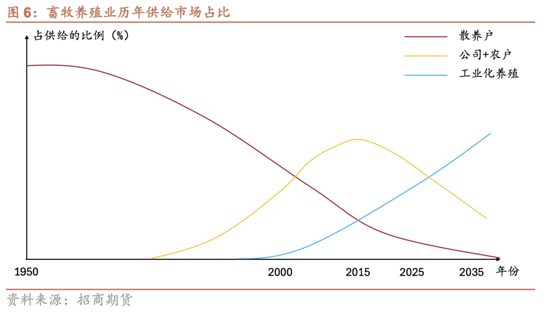 如图6所示,随着中小养殖户退出与行业出清推进,生猪养殖行业的市场集中度持续提升,龙头企业的主导地位进一步强化。近年来,我国生猪养殖已从传统的分散养殖模式,逐步向规模化、工业化模式转型,头部企业通过自繁自养、一体化管理及成本控制能力,实现显著的规模优势。