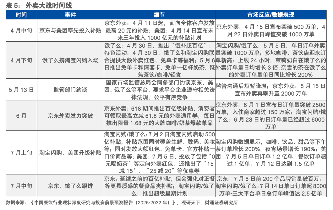 年中以来,外卖平台发起了一轮补贴活动,这些活动为餐饮行业带来巨大流量红利或将进一步促进持续复苏。4月初,京东外卖上线百亿补贴;5月,饿了么也以“超百亿补贴”入局,而新推出的淘宝闪购,以淘系庞大的资源持续加码补贴,拿出500亿元投入冲量,闪电战变成了持久战。在此背景下,前期观望的美团下场,也发放了大量优惠券。从效果看,三大平台单日峰值订单量超2.5亿单,部分餐饮店反应出现爆单情况,餐饮行业迎来大量线上流量,特别是咖啡、茶饮店的外卖订单需求激增。结果来看,头部的餐饮企业或是此轮补贴的受益者,一方面是平台的流量倾斜,另一方面也与头部品牌餐饮自身实力有关。