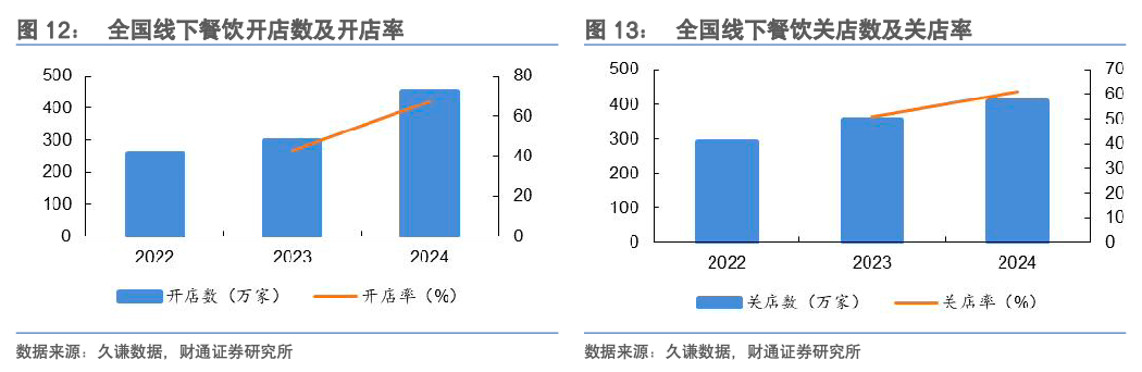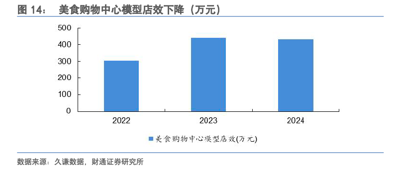 根据久谦中台统计的数据显示,2024年开店与关店并存,开店率略高于关店率。新开店数增至451万家,开店率67.5%。与2023年相比2024年美食购物中心模型店效普遍同比个位数下滑。在店效同比走低背景下,2024年闭店数攀升至409万家,闭店率61.2%,超2023年。