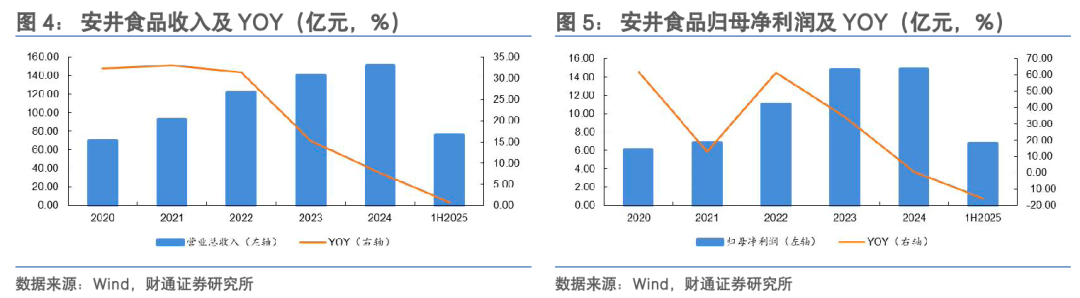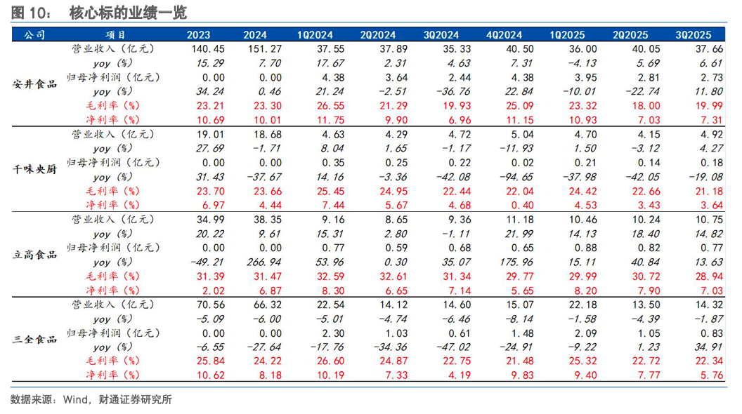 1)行业龙头安井食品Q3营收与净利润增速均较上半年显著提速。3Q25实现收入37.66亿元,同比+6.61%;归母净利润2.73亿元,同比+11.80%;扣非归母净利润2.64亿元,同比+15.27%,实现增长稳健。Q3实现净利率7.31%,同比+0.35pcts,实现销售/管理费用率分别为6.09%/3.01%,同比-0.31pcts/-0.52pcts。价格策略调整,费效持续改善。