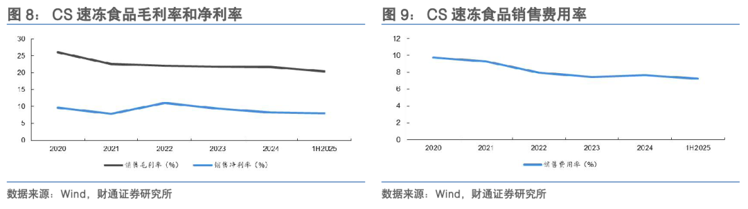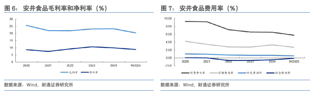以安井食品为例,自2023年下半年餐饮开启价格战后公司营收增速放缓,1H2025营收增速仅有0.80%,而2020-2022年营收增速都在30%以上。同时盈利能力也阶段性承压,1H2025归母净利润同比下滑15.79%,而2022和2023年归母净利润增长率均超过30%。从近五年公司毛净利率走势图看,2024年毛净利率放缓,2025年上半年下滑明显。进一步从费用率角度拆分,受制于竞争的加剧和终端需求的减弱,公司在整体费用的管控上更加谨慎和理性。