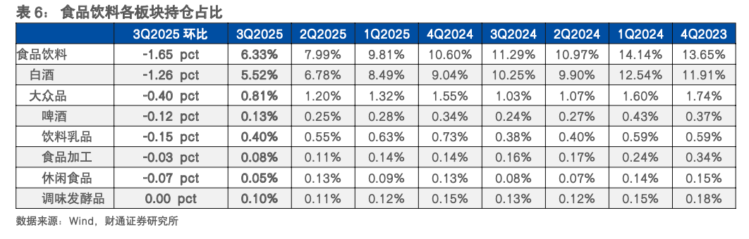 3Q2025食品加工持仓进一步小幅下降。3Q2025食品加工持仓比例环比减少 0.03pct至0.08%,4Q2023-3Q2025季末食品加工持仓比例分别为0.34%、0.24%、0.17%、0.16%、0.14%、0.14%、0.11%、0.08%。