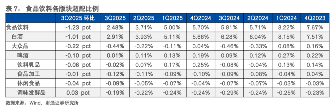 食品加工低配增加。从超配比例来看,食品加工3Q2025超配比例环比下降 0.01pct至-0.12%,低配程度略有扩大,4Q2023-3Q2025季末食品加工超配比例分别为0.04%、-0.04%、-0.08%、-0.09%、-0.10%、-0.09%、-0.11%、-0.12%,持续处于低配状态。