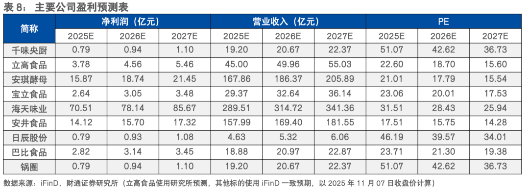 4)千味央厨的营收增速也由负转正,净利率环比改善,显示经营态势触底回升。3Q25实现收入4.92亿元,同比+4.27%;利润端Q3实现净利率3.64%,环比+0.21pcts。