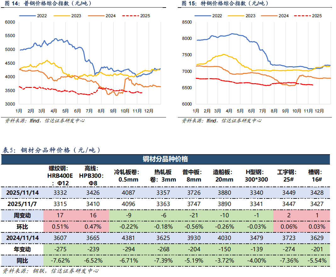 ⚫ 普钢综合指数:截至11月14日,普钢综合指数3422.3元/吨,周环比增加2.47元/吨,周环比增加0.07%,同比下降6.85%。