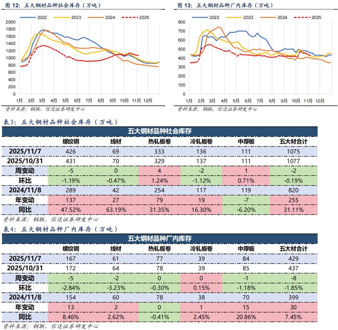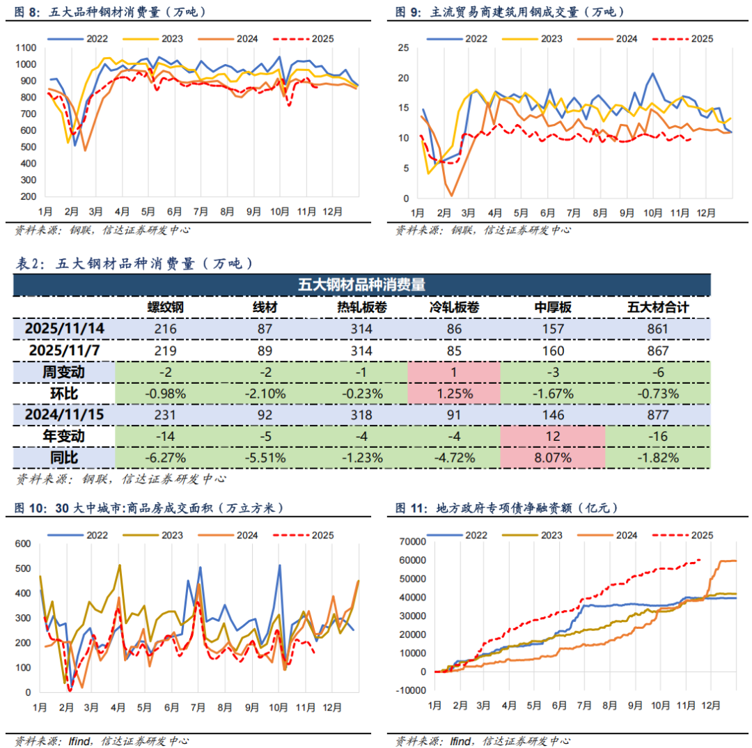 ⚫五大钢材品种消费量:截至11月14日,五大钢材品种消费量860.6万吨,周环比下降6.33万吨,周环比下降0.73%。