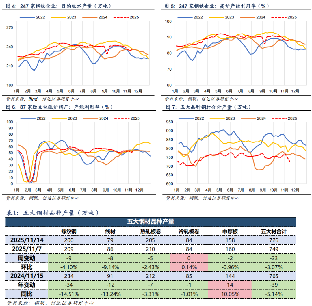 ⚫五大钢材品种产量:截至11月14日,五大钢材品种产量726.1万吨,周环比下降22.98万吨,周环比下降3.07%。