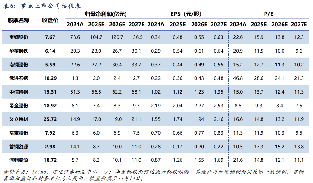 投资建议:虽然钢铁行业现阶段面临供需矛盾突出等困扰,行业利润整体下行,但伴随系列“稳增长”政策纵深推进,钢铁需求总量有望在房地产筑底企稳、基建投资稳中有增、制造业持续发展、钢铁出口高位等支撑下保持平稳或甚至边际略增,反观平控政策预期下钢铁供给总量趋紧且产业集中度持续趋强,钢铁行业供需总体形势有望维持平稳。与此同时,经济高质量发展和新质生产力宏观趋势下,特别是受益于能源周期、国产替代、高端装备制造的高壁垒高附加值的高端钢材有望充分受益。总体上,我们认为未来钢铁行业产业格局有望稳中趋好,叠加当前部分公司已经处于价值低估区域,现阶段仍具结构性投资机遇,尤其是拥有较高毛利率水平的优特钢企业和成本管控力度强、具备规模效应的龙头钢企,未来存在估值修复的机会,维持行业“看好”评级。建议关注:1)设备先进性高、环保水平优的区域性龙头企业山东钢铁、华菱钢铁、首钢股份、沙钢股份、三钢闽光等;2)布局整合重组、具备优异成长性的宝钢股份、南钢股份、马钢股份、新钢股份、鞍钢股份等;3)充分受益新一轮能源周期的优特钢企业中信特钢、久立特材、方大特钢、常宝股份、武进不锈、友发集团等;4)具备突出竞争优势的高壁垒上游原料供应企业首钢资源、河钢资源、方大炭素等。