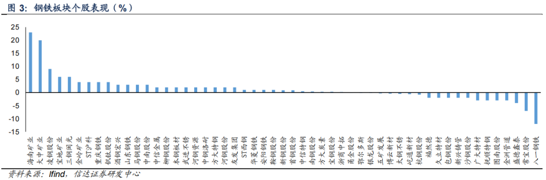 本周钢铁板块中涨跌幅前三的分别为海南矿业(22.95%)、大中矿业(20.31%)、凌钢股份(8.97%)。
