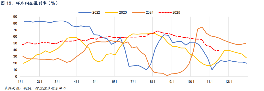 ⚫ 247家钢铁企业盈利率:截至11月14日,247家钢铁企业盈利率为38.96%,周环比下降0.9pct。