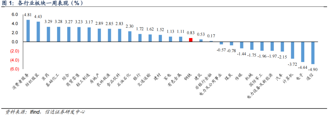 本周钢铁板块上涨0.83%,表现优于大盘;本周沪深300下跌1.08%到4628.14;涨跌幅前三的行业分别是消费者服务(4.81%)、纺织服装(4.43%)、医药(3.29%)。