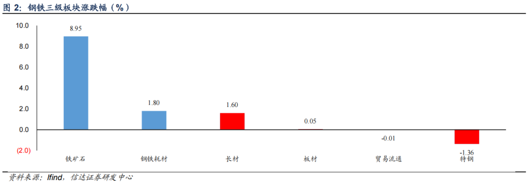 本周特钢板块下跌1.36%,长材板块上涨1.60%,板材板块上涨0.05%;铁矿石板块上涨8.95%,钢铁耗材板块上涨1.80%,贸易流通板块下跌0.006%。