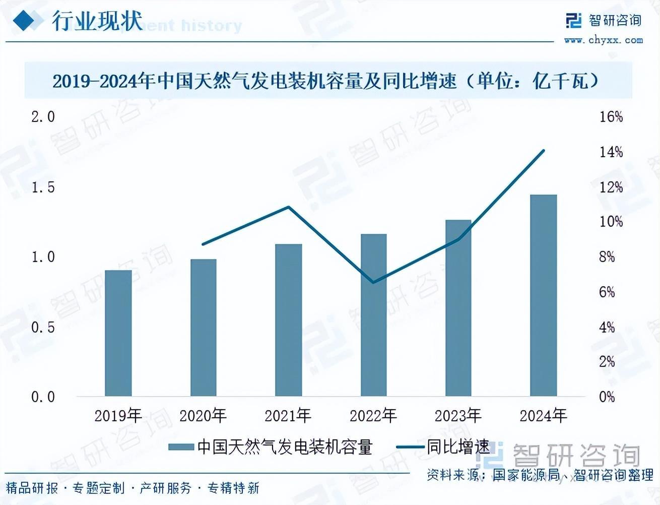 燃气轮机发电机组作为能源转换与电力输出的核心装备,凭借其高效能、快速启停及灵活调峰等特性,广泛应用于电力调峰、工业驱动、数据中心供电及分布式能源等关键领域。其中,天然气发电领域凭借其清洁低碳、运行稳定的优势,已成为燃气轮机应用的核心场景。近年来,在《关于加快推进天然气利用的意见》等政策驱动下,我国积极推进能源结构转型,鼓励风电、光伏等可再生能源发电端配套建设燃气调峰电站,通过“风光气储”多能互补模式提升电源侧稳定性,并开展了一系列示范项目验证技术可行性。在此政策与市场双重推动下,天然气发电装机规模持续扩张。数据显示:我国天然气发电装机容量从2019年的0.90亿千瓦增长至2024年的1.44亿千瓦,年均复合增长率达9.8%,展现出强劲的发展势头。随着“双碳”战略深入实施及AI算力需求爆发式增长带来的电力负荷特性变化,天然气发电作为保障电网安全运行、促进新能源消纳的关键支撑,其装机规模有望进一步扩大,进而为燃气轮机发电机组行业创造持续的市场需求增长空间。