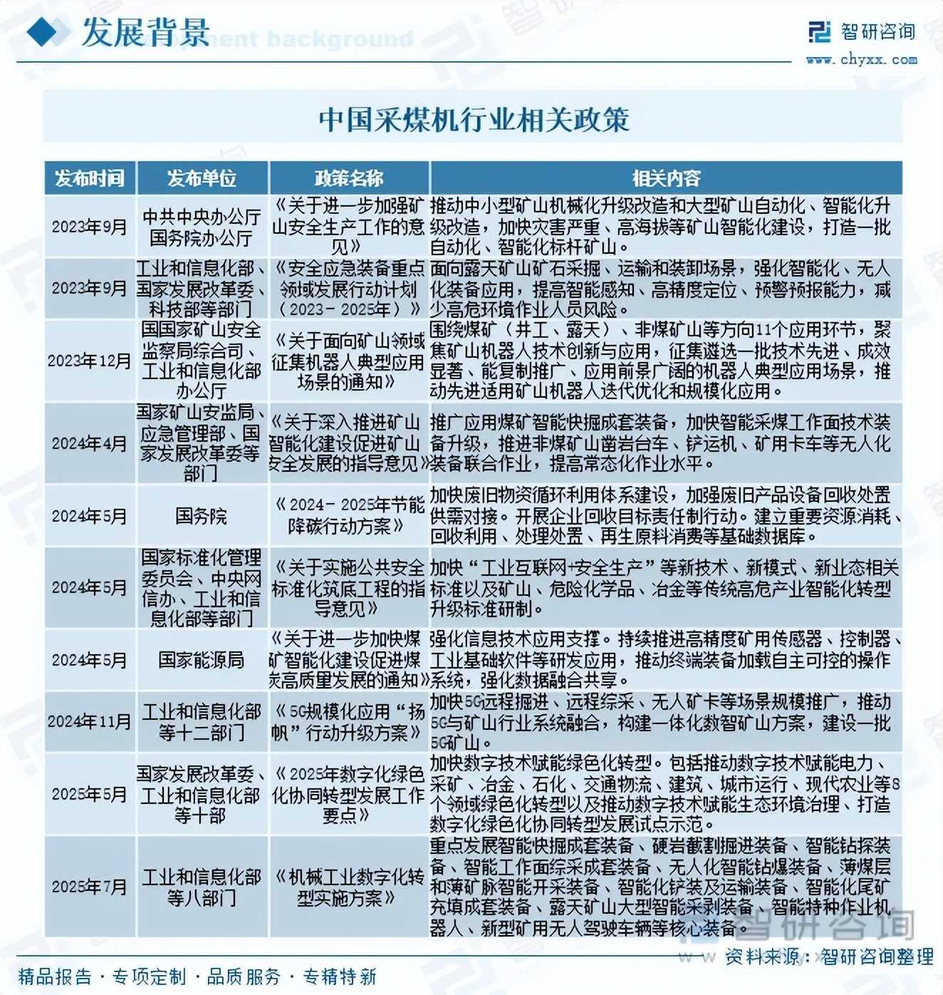 我国高度重视包括采煤机在内的煤炭机械产业发展,相继发布《关于进一步加强矿山安全生产工作的意见》《安全应急装备重点领域发展行动计划(2023-2025年)》《关于面向矿山领域征集机器人典型应用场景的通知》《关于深入推进矿山智能化建设促进矿山安全发展的指导意见》《2024-2025年节能降碳行动方案》《关于实施公共安全标准化筑底工程的指导意见》《关于进一步加快煤矿智能化建设促进煤炭高质量发展的通知》《5G规模化应用“扬帆”行动升级方案》《2025年数字化绿色化协同转型发展工作要点》《机械工业数字化转型实施方案》等一系列政策支持、鼓励和规范行业发展,为我国采煤机行业发展提供了良好的政策环境。