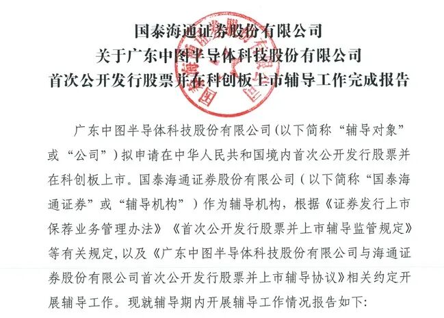 12月6日,证监会官网披露了国泰海通证券关于广东中图半导体科技股份有限公司(简称“中图半导体”)首次公开发行股票并在科创板上市辅导工作的完成报告,标志着该公司IPO进程进入新阶段。
