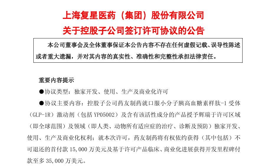 复星国际(00656.HK)旗下复星医药(02196.HK)宣布,其控股子公司药友制药、复星医药产业与辉瑞(Pfizer)签订许可协议,授权辉瑞在全球范围内开发、制造及商业化口服小分子胰高血糖素样肽-1受体(GLP-1R)激动剂(包括YP05002)及相关产品,许可领域包括所有人类及动物适应症的治疗、诊断及预防。