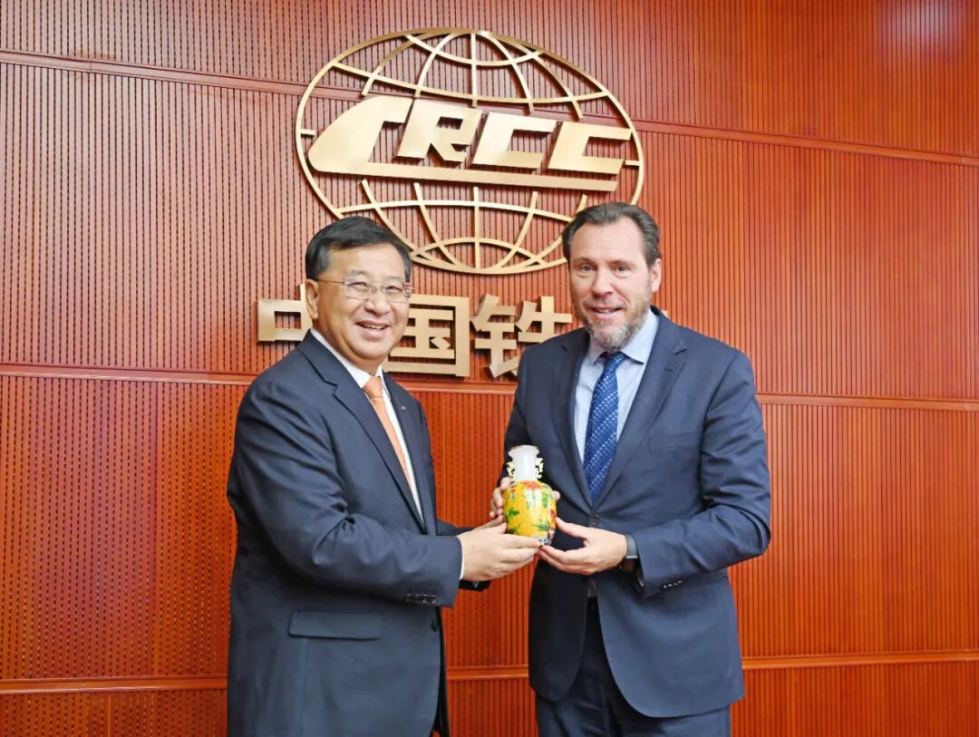 戴和根对普恩特大臣、贝坦索斯大使到访中国铁建表示热烈欢迎,对西班牙交通部、西班牙驻华使馆给予中国铁建的关心支持表示衷心感谢,并介绍了中国铁建基本情况和在西业务开展情况。戴和根表示,中国铁建高度重视西班牙市场,公司所属阿尔德萨公司在西实施了一批标志性项目,特别是贝尔维斯光伏电站项目于今年3月正式商业运营,成为中西两国绿色合作的典范。中国铁建将发挥全产业链以及一体化服务优势,积极参与西班牙高铁提速升级、基础设施建设与维保项目,深化双方在工程装备与新兴产业领域的合作,为巩固中西传统友谊与西班牙交通网络建设贡献铁建力量。