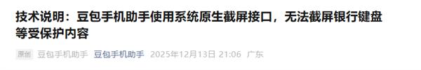 12月13日,豆包手机助手又发布技术说明,称豆包手机助手使用系统原生截屏接口,无法截屏银行键盘等受保护内容。
