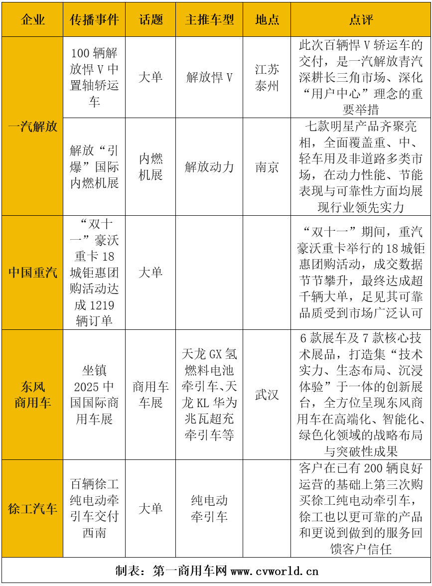 除上述事件外,11月份,重卡市场较有影响力的事件和话题还包括:陕汽重卡与万里扬签订战略合作协议;北奔重汽斩获“2025年度基建行业第一推荐品牌”大奖;第20000辆下线,北汽重卡驶入发展快车道;2025远程燃冬创富季暨星瀚重卡品鉴会在深圳举办等。