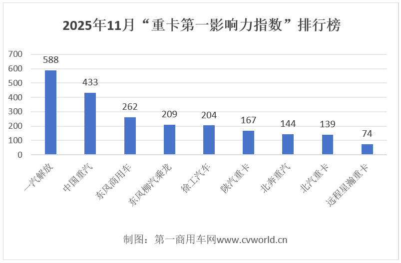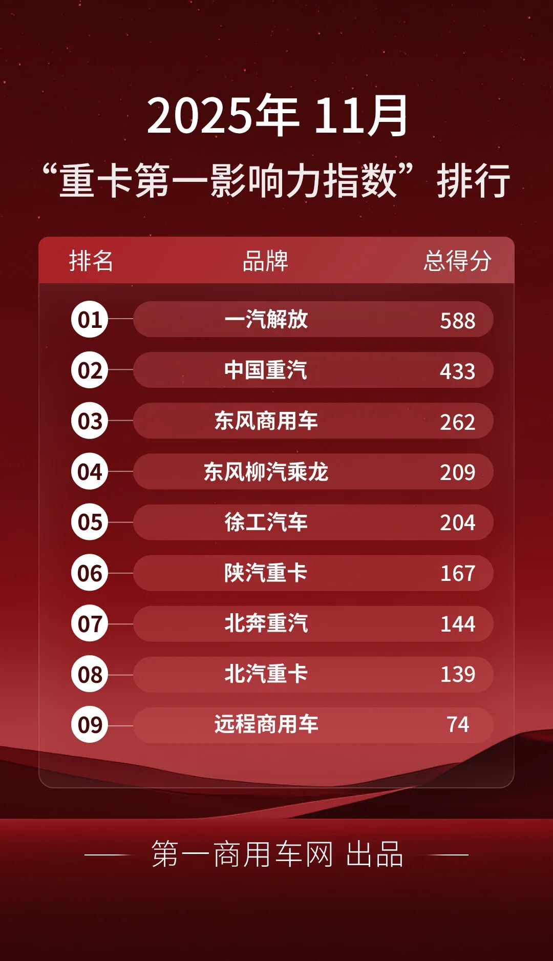 11月份“重卡第一影响力指数”冠军依然花落一汽解放,且进一步拉开了与其他品牌的差距。2025年以来,一汽解放已连续11个月夺冠,没有意外的话,全年总冠军也将被其收入囊中。