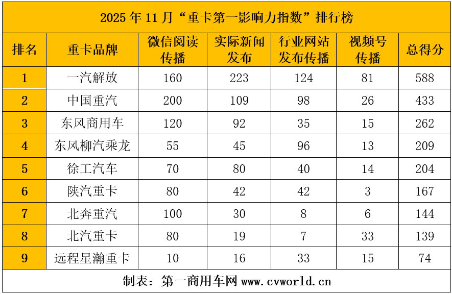 12月份,各重卡品牌为冲击年度目标,市场竞争势必会愈发激烈,加上年会季的到来,各主机厂在传播方面也会越发重视,“重卡第一影响力指数”月度得分或将进一步提升。那么,2025年的最后一个月,各重卡品牌会有哪些经典案例诞生呢?