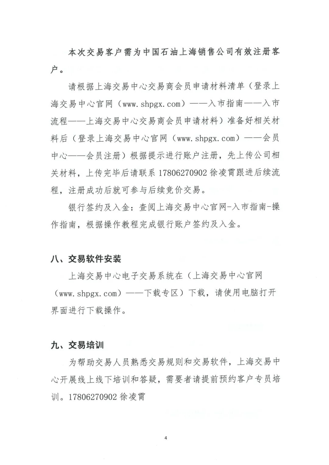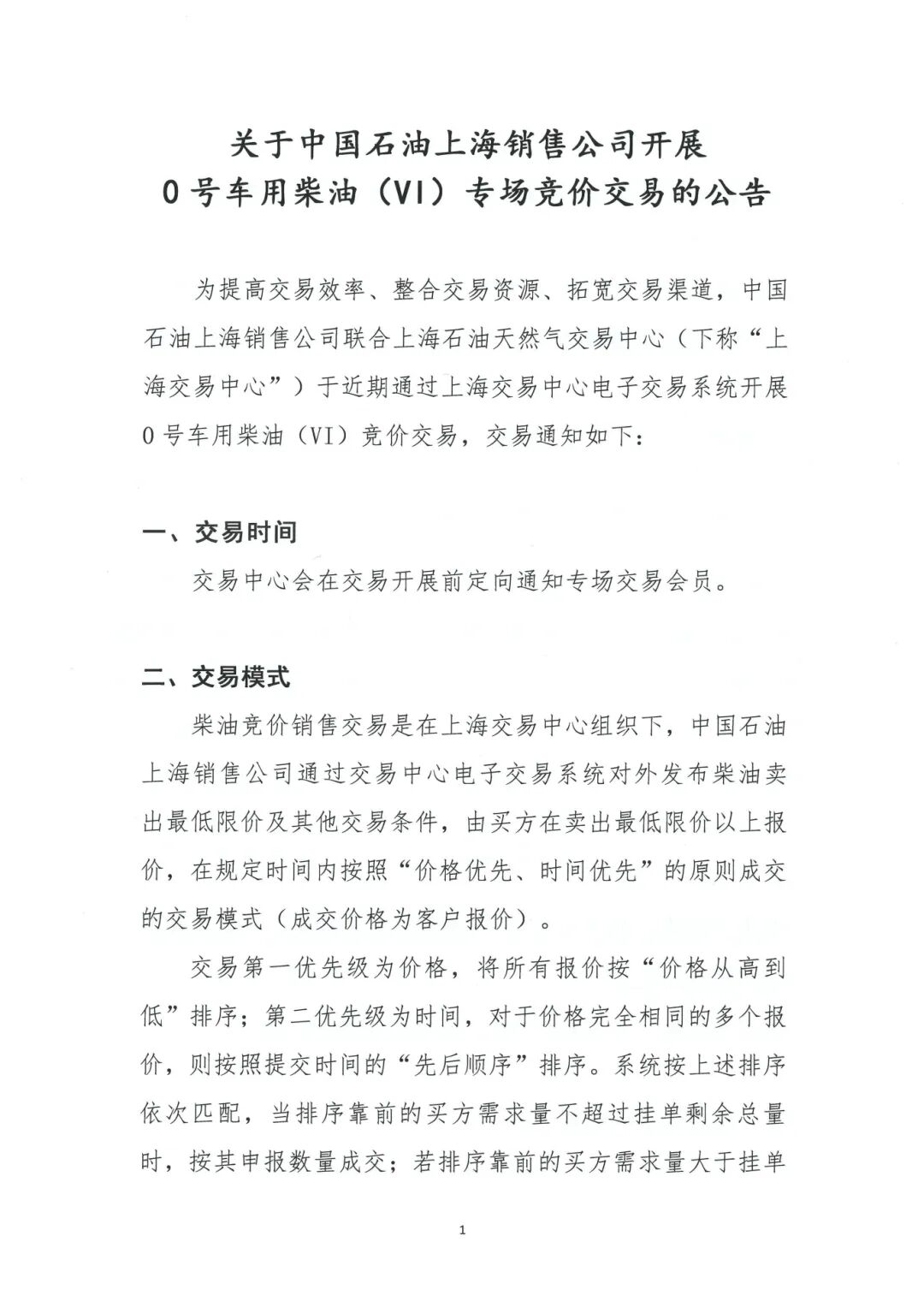 SHPGX导读:为提高交易效率、整合交易资源、拓宽交易渠道,中国石油上海销售公司联合上海石油天然气交易中心于近期通过上海交易中心电子交易系统开展0号车用柴油(VI)竞价交易,交易通知如下: