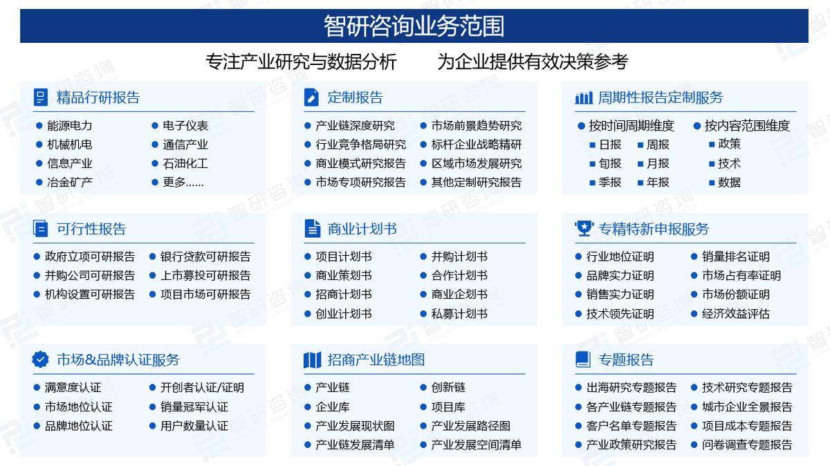 智研咨询专注产业咨询十五年,是中国产业咨询领域专业服务机构。公司以“用信息驱动产业发展,为企业投资决策赋能”为品牌理念。为企业提供专业的产业咨询服务,主要服务包含精品行研报告、专项定制、月度专题、市场地位证明、专精特新申报、可研报告、商业计划书、产业规划等。提供周报/月报/季报/年报等定期报告和定制数据,内容涵盖政策监测、企业动态、行业数据、企业排行、产品价格变化、投融资概览、市场机遇及风险分析等。