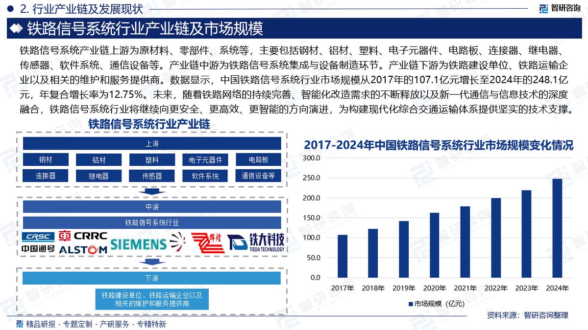 市场规模:轨道交通信号系统是轨道交通设备中的重要组成部分,按应用场景一般分为铁路信号系统和城市轨道交通信号系统。其中铁路信号系统一般是指铁路上应用的联锁、列控、行车指挥等设备的总称,是保障列车安全运行的重要组成部分,关乎整个轨道交通系统安全、高效运行。中国政府始终高度重视铁路基础设施的建设与发展,持续加大对该领域的投入,为铁路信号系统行业提供了强有力的政策支持与资金保障。2024年6月,交通运输部、国家铁路局印发《关于加强城际铁路、市域(郊)铁路监督管理的意见》,明确提出在土建工程、信号制式、供电制式、通信信息系统等方面实现不同轨道交通系统技术标准协调配套和相互兼容,实现城市内外交通有效衔接,提高出行服务快速化、便捷化水平。此外,随着“八纵八横”高铁网络规划的逐步落实与不断延伸,高铁线路持续拓展,连接起更多城市与区域,进一步推动了铁路信号系统的升级与应用。数据显示,中国铁路信号系统行业市场规模从2017年的107.1亿元增长至2024年的248.1亿元,年复合增长率为12.75%。未来,随着铁路网络的持续完善、智能化改造需求的不断释放以及新一代通信与信息技术的深度融合,铁路信号系统行业将继续向更安全、更高效、更智能的方向演进,为构建现代化综合交通运输体系提供坚实的技术支撑。