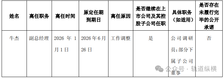 2026年1月1日,株洲中车时代电气股份有限公司(以下简称“公司”)董事会收到公司副总经理牛杰先生的辞职报告。牛杰先生因工作调整原因辞去副总经理职务。辞职后,牛杰先生仍然在公司任职,担任公司调研员及部分下属子公司的董事。