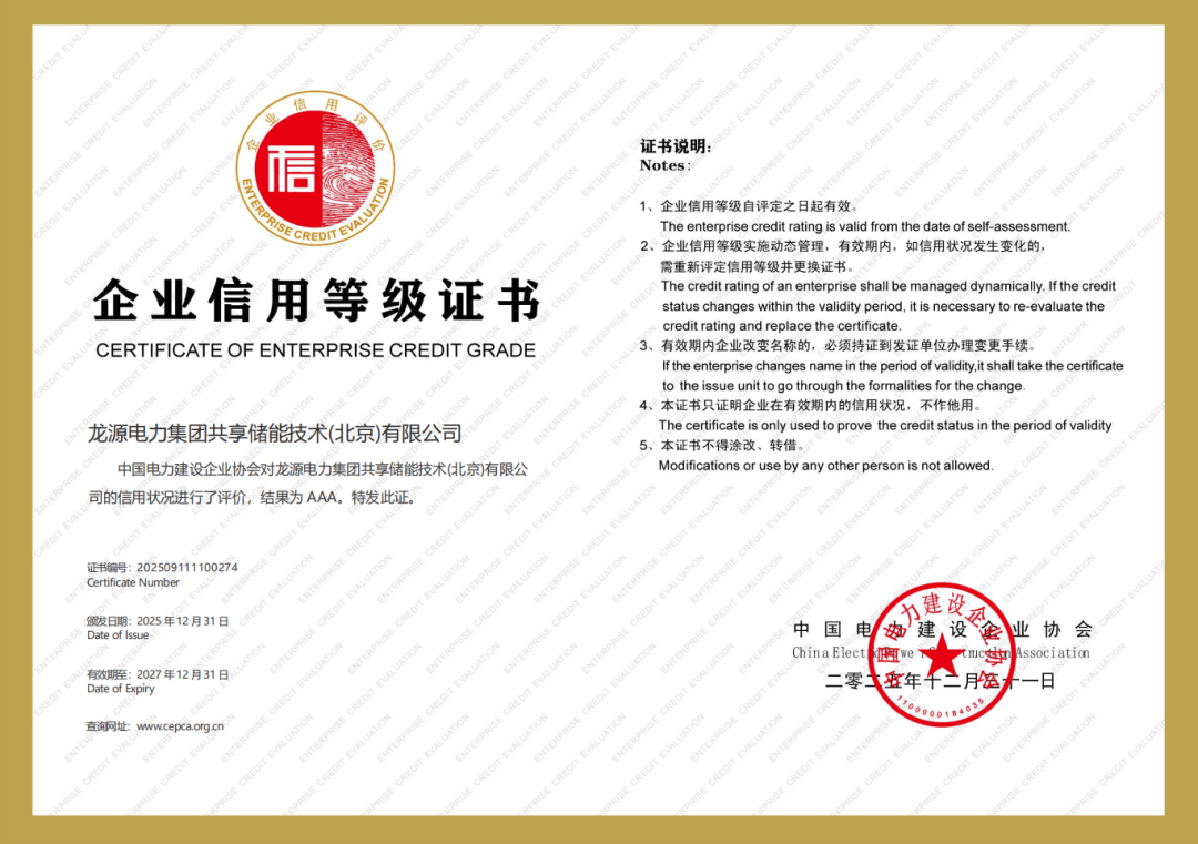近日,龙源电力共享储能技术(北京)有限公司获评中国电力建设企业协会2025年度企业信用等级评价AAA级。这一行业最高信用等级,标志着公司在诚信经营、合规管理、项目履约、质量安全及社会责任等领域的综合实力均处于行业领先地位。