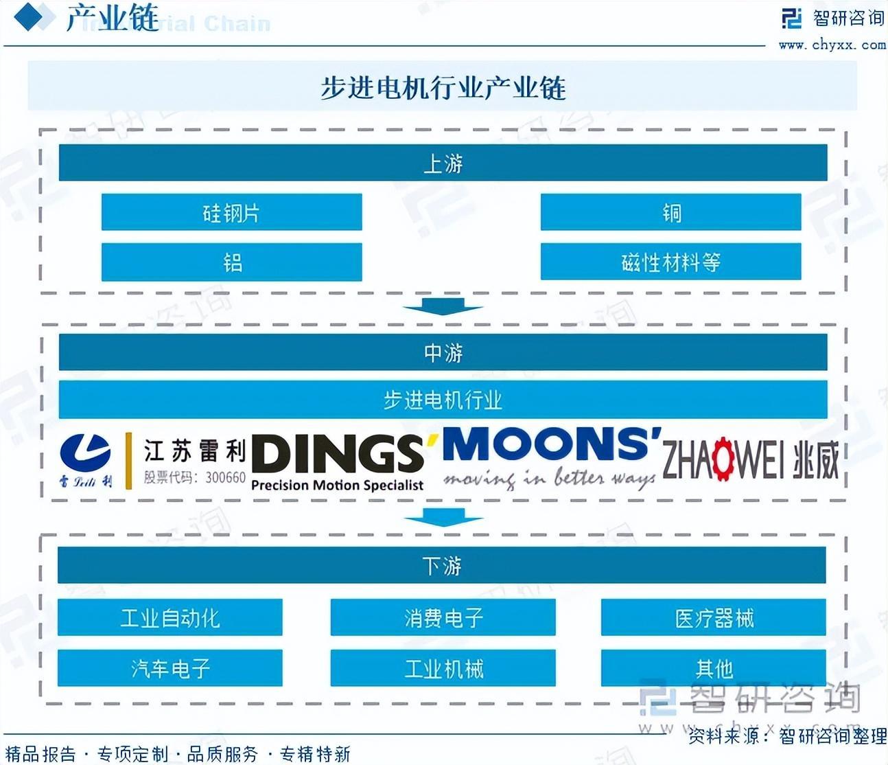 步进电机产业链上游为原材料,包括硅钢片、铜、铝、磁性材料等。产业链中游为步进电机的生产制造环节。产业链下游为步进电机的应用领域,包括工业自动化、消费电子、医疗器械、汽车电子、工业机械等。