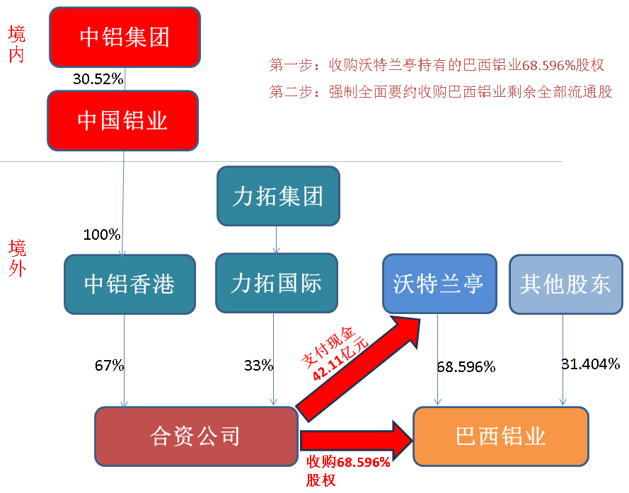 作为中铝集团所属的核心控股企业,中国铝业拥有完整的全产业链,将通过全资子公司中国铝业香港有限公司,与力拓国际控股有限公司在巴西共同设立合资公司,并以该合资公司为主体,现金收购沃特兰亭持有的巴西铝业68.596%股权,约需42.11亿元。交易完成后,巴西铝业将成为中国铝业纳入合并报表范围的控股子公司。前述收购完成后,合资公司还将根据巴西法律及证券监管规定对巴西铝业剩余全部流通股发起强制要约收购。