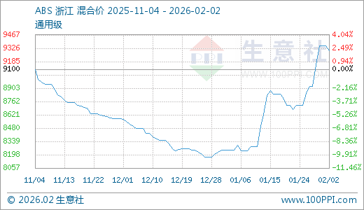据生意社监测,ABS02月02日最新价格9300.00元/吨,最近5天上涨4.20%,10天上涨6.59%,30天上涨12.73%。