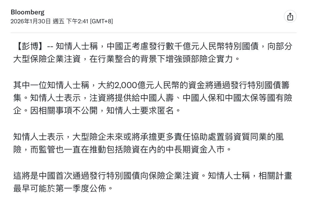 最近有消息称国家考虑发行约2000亿元特别国债,向部分大型保险公司注资。消息来源于彭博社,虽然目前没有正式消息出来,但相关方也没有辟谣或否认。