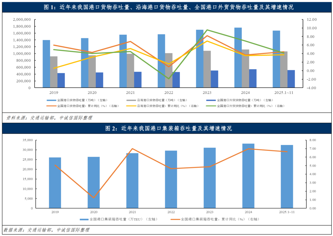 2025年1~11月,受益于关税博弈下的多波抢出口效应、非洲及拉美等新兴市场的需求增长和我国制造业转型升级效果明显带动机电产品等新三样出口持续快速增长,我国集装箱吞吐量在上年同期的高基数下仍同比增长6.6%至3.25亿TEU,其中外贸集装箱同比增长9.5%且占比仍在50%以上。同期内贸运输需求及大宗商品进口需求在下半年内需政策落地的情况下整体实现平稳增长,以上综合使得2025年1~11月全国港口货物吞吐量同比增长4.41%至167.5亿吨,其中外贸货物吞吐量同比增长4.12%至51.61亿吨。
