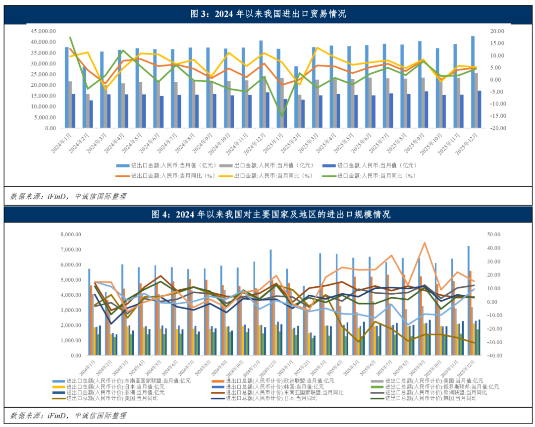从国内经济及贸易发展情况来看,2025年在需求不足、产能过剩及结构性转型任务艰巨的情况下,我国制造业PMI均值为49.6%,较2024年的49.8%小幅回落且处于近年低位;但受季节性补库、政策效应释放与基数效应影响,12月PMI回升至扩张区间,我国制造业仍具有较好的恢复韧性。对外贸易方面,2025年,我国货物贸易进出口总值达45.47万亿元人民币,同比增长3.8%,增速虽较2024年放缓,但外贸在复杂环境中仍展现强劲韧性,贸易多元化格局加速深化。分区域来看,受关税政策影响,我国对美国进出口规模显著下降,降幅超过20%,且对美进出口总额占我国外贸总值的比重由2024年的11.2%降至8.8%,贸易“去美国化”加速;受益于产业互补与市场需求改善,对欧盟进出口规模同比增长6%,增速较2024年有所提升,其占我国进出口总额比重为13%;随着我国对外开放力度加码,新兴国家市场消费需求及工业化带来的基建、机械、电力等需求增长,同期我国对共建“一带一路”国家进出口同比增长6.3%,占比达51.9%,对东盟、拉美、非洲进出口同比增长8%、6.5%和18.4%。分产品结构来看,中国高科技、高附加值与绿色产品的出口强劲,对冲了传统劳动密集型产品收缩的趋势,受益于全球AI投资增长及我国制造业转型升级,芯片、新能源汽车等产品出口持续攀升,机电产品占出口总额比重超六成。