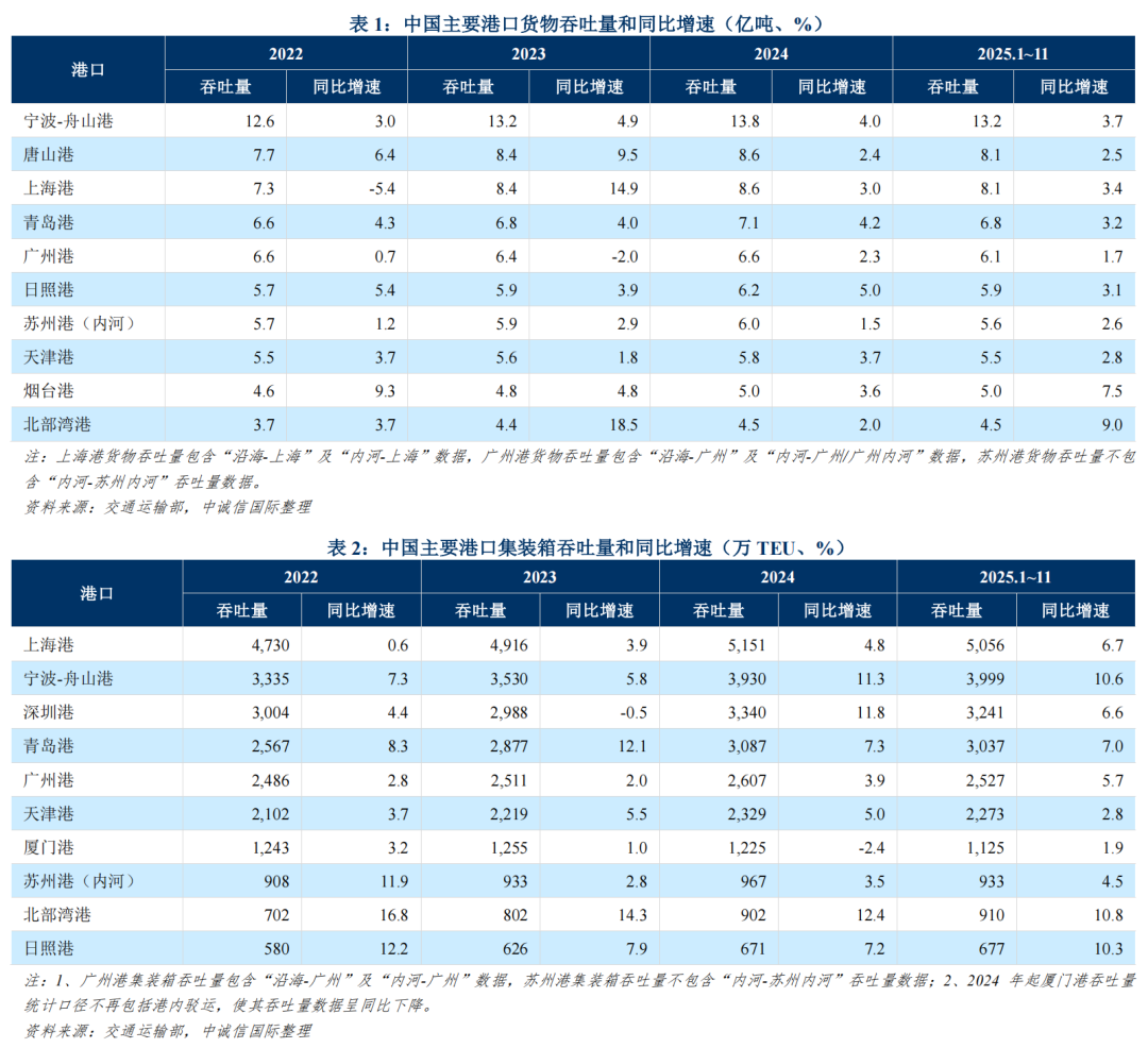 2025年以来,多波抢出口、新兴市场需求增长及高附加值产品出口增加使得集装箱吞吐量实现较高增长;同期内贸运输和大宗商品进口需求平稳增长带动全国港口货物吞吐量实现较好增长且增速高于上年同期。同时,全国主要港口竞争格局未发生较大变化,枢纽大港规模优势进一步强化、部分南方港口增长亦较为强劲。