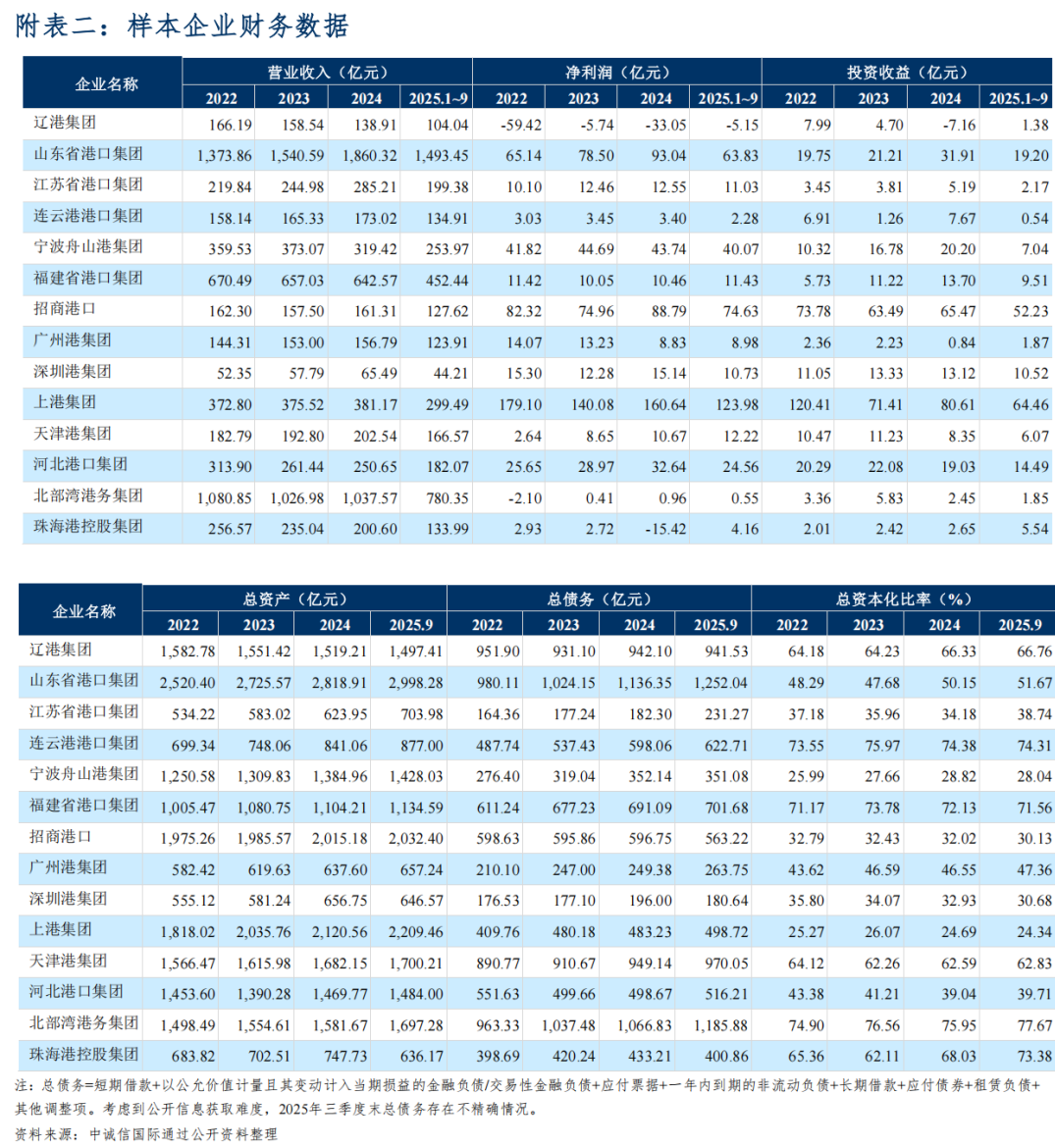 整体来看,全球经济及贸易增长乏力且外贸环境仍具不确定性,对港口行业需求形成一定制约,但我国外贸仍具韧性,且内贸和大宗商品进口需求亦对港口吞吐量形成一定支撑,预计2026年港口企业盈利获现能力将小幅增长;同时,港口行业整体固定资产投资仍将维持较大规模,但考虑到规模较大的运河及航道建设投资通常由财政资金覆盖,港口企业负责的码头投资建设力度整体有所放缓,预计港口企业的财务杠杆将呈现小幅下降趋势,偿债能力稳中向好。
