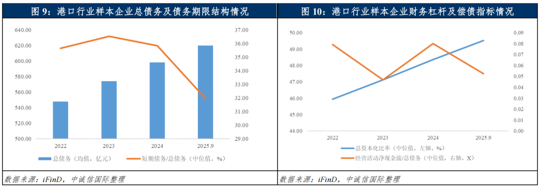 中诚信国际采用了国内债券市场发行债券的14家主要沿海内河省份港口企业进行样本财务分析(样本企业见附录)。盈利能力方面,2025年前三季度,受贸易业务调整收入确认方式及非港口业务规模收缩影响,约五成样本企业营业收入同比下降,故港口货物吞吐量增长带动14家样本企业平均营业收入仅同比增长2.44%,同期平均毛利率小幅增长,样本企业经营性业务利润2同比增长7.81%。结构性宽松使企业综合融资成本下降,2025年前三季度样本企业平均财务费用同比下降6.21%,但受在建转固推升折旧成本、投资收益波动及其他非经常性损益影响,平均净利润同比小幅下降0.93%,整体来看,2025年以来港口企业核心主业港口经营业绩稳中向好,盈利能力虽受非港口业务及非经常性损益影响有所波动但仍处于较好水平。