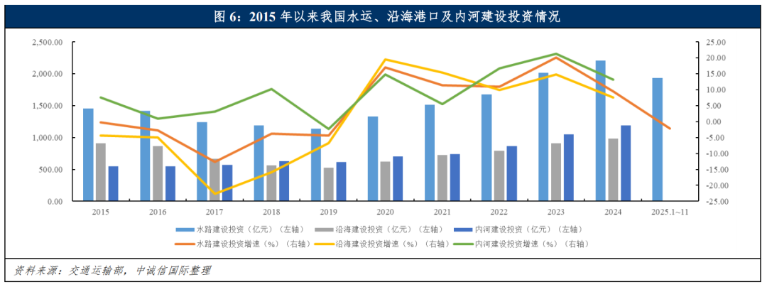 2025年以来我国水运建设投资虽同比小幅下降但仍保持较高规模,股权类投资高峰期已过但仍有内部整合和海外投资需求;预计短期内内河建设投资规模将保持增长,股权类投资规模进一步下降。