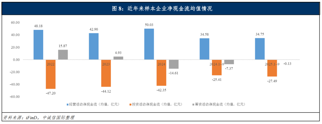 现金流方面,2025年前三季度,样本企业平均经营活动净现金流同比小幅增长0.49%,平均(销售商品、提供劳务收到的现金-购买商品、接受劳务支付的现金)同比增长6.37%,经营获现能力整体保持较好水平。投资活动方面,港口企业的投资建设以港口码头建设、堆场及仓库设施建设为主,2025年前三季度,山东省港口集团、江苏省港口集团、宁波舟山港集团和北部湾集团仍保持较大的固定资产投资规模,带动样本企业平均构建固定资产、无形资产和其他长期资产支付的现金同比大幅增长22.66%,同期平均投资活动现金净流出规模同比增长8.17%。港口企业经营获现能力向好能对投资活动形成一定弥补,但投资活动仍需借助于外部融资,2025年前三季度样本港口企业平均筹资活动现金流呈净流出状态且净流出规模有所收窄,但样本企业形成明显分化,其中招商港口、上港集团及宁波舟山港集团盈利获现能力强且有一定富裕资金可偿还债务,辽港集团及河北港口集团投资支出规模下降,其筹资活动净现金流均呈大规模净流出;而山东省港口集团及江苏省港口集团由于投资建设规模较大,其筹资活动净现金流呈大规模净流入。