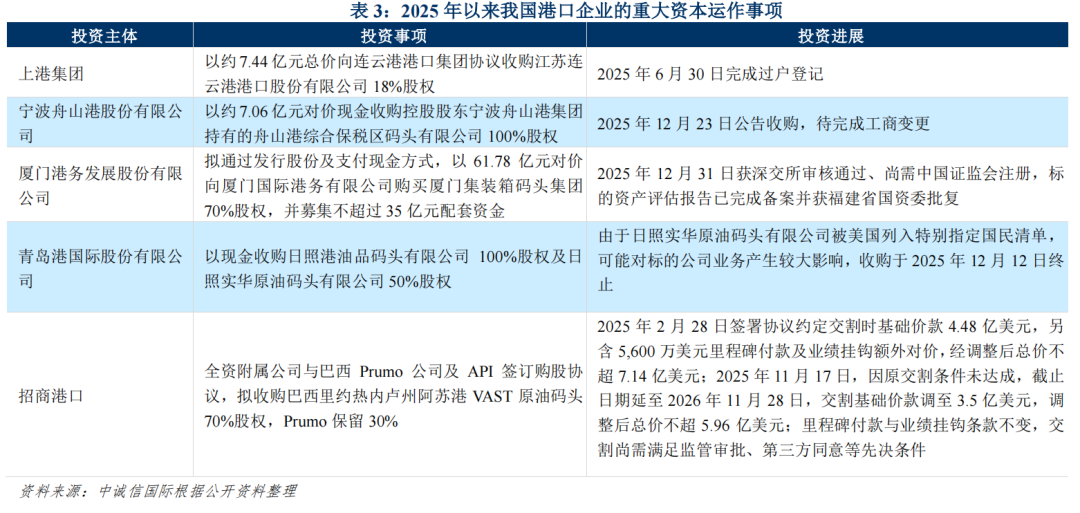 资本运作方面,港口企业资源整合及战略合作交叉持股的高峰时期已过,2025年的股权类投资主要围绕解决同业竞争、整合区域港口资源以提高协同效应及海外战略布局展开。未来大型港口集团内部融合及港航企业资本合作仍有部分股权投资需求;海外投资受地缘政治和法律影响不确定性亦较高,预计2026年我国港口行业整体股权类投资规模仍将保持下降趋势。