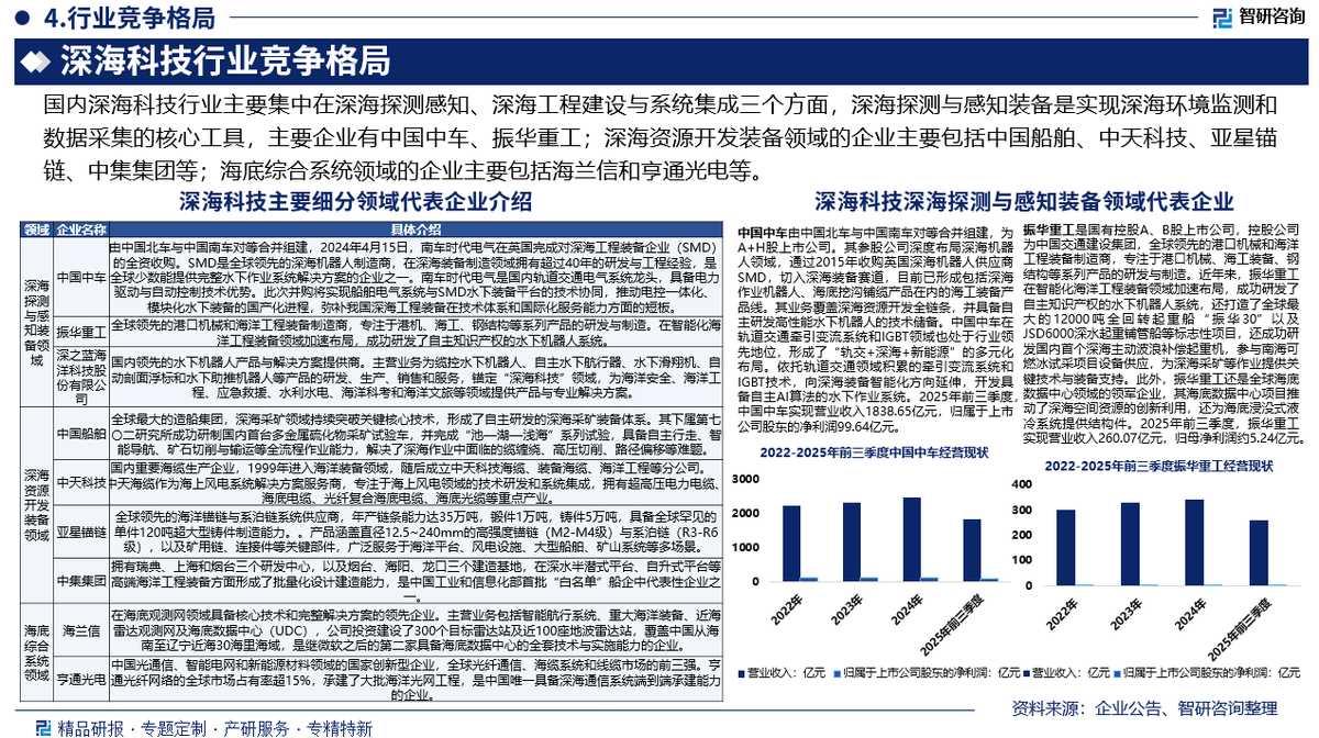 竞争情况:国内深海科技行业主要集中在深海探测感知、深海工程建设与系统集成三个方面,深海探测与感知装备是实现深海环境监测和数据采集的核心工具,主要企业有中国中车、振华重工;深海资源开发装备领域的企业主要包括中国船舶、中天科技、亚星锚链、中集集团等;海底综合系统领域的企业主要包括海兰信和亨通光电等。